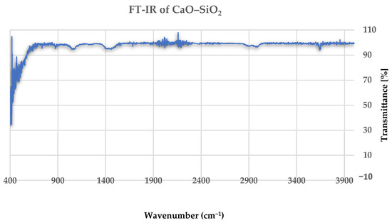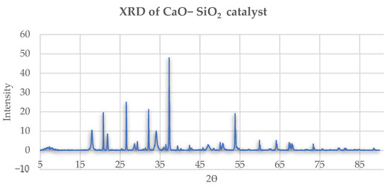 The FT-IR spectra of the catalyst are shown in Figure 4. CaO was responsible for the broad absorption in the 500–700 cm−1 range, while the wavenumber of the SiO region was about 1200 cm−1.