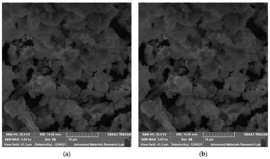 The CaO–SiO2 catalyst was characterized using X-ray diffraction (XRD), scanning electron microscopy (SEM), and Fourier transform infrared spectroscopy (FT-IR). The presence of calcium oxide was detected at 2Ɵ values of about 32.145°, 37.313°, 53.795°, 63.99°, 67.928°, and 79.50°, while silica was observed at 20.737°, 26.557°, and 50.07° (see Figure 2). Figure 3a,b shows SEM images of the catalysts at 10 µm and 5 µm scales. The images show a flour-like structure and uniform morphology over the entire surface.