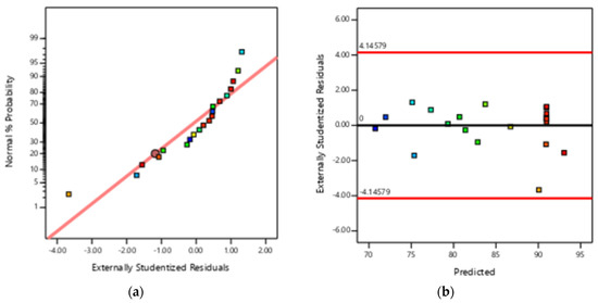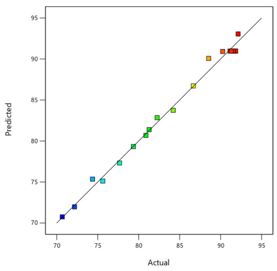 The plot of predicted and actual values of biodiesel yield (Figure 5) shows that the model is a good estimate for predicting the actual values of the yield, since the predicted and actual values are very close. In addition, the analysis of the residuals (Figure 6), such as the plot of normal probability and the plot of residuals versus predicted values, shows no significant deviations from normality or evidence that the model shows signs of dependence or inadequacy. Since there were no discernible patterns in the plot, it could be assumed that the residuals have a constant variance. The different colors in the plots in Figure 5 and Figure 6 represent the values of the yield of biodiesel ranging from 70.68% to 92.14%, where blue is the lowest yield and red is the highest.