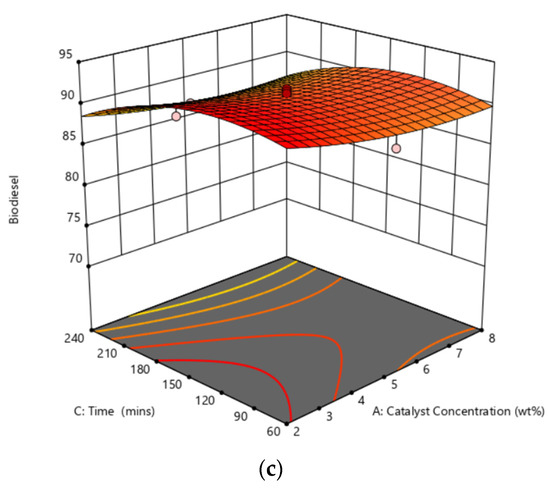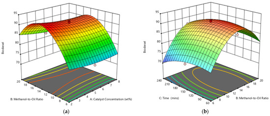 Figure 7 shows the 3D contour of the interactions between the different parameters chosen. The first plot (Figure 7a) for the interaction between parameters A (Catalyst Concentration) and B (Methanol-to-Oil Ratio) shows that the value of the methanol-to-oil ratio leading to the highest yield is somewhere in the middle of the selected range of values, while the change in catalyst concentration is not very significant. Plotting the interaction of parameters B (Methanol-to-Oil Ratio) and C (Time) in Figure 7b showed that the highest biodiesel yields are obtained somewhere in the middle of the ranges considered for both parameters, and that further increasing either parameter does not contribute to increasing the biodiesel yield. Figure 7c represents the interaction between parameters A (Catalyst Concentration) and C (Time), which does not appear to be significant, as shown by both the 3D contour plot and the results of the ANOVA.