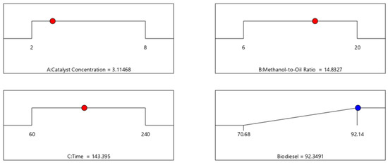 To obtain the optimal parameters and optimize the biodiesel production process, the desired reaction was set to the maximum in the software to obtain the highest yield. The software generated the optimal values for the three parameters as a catalyst concentration of 3.11 wt%, a methanol-to-oil ratio of 14.83:1, and a reaction time of 143 min, which resulted in the optimal yield percentage of 92.3419%, as shown in Figure 8. These values coincided with the highest biodiesel yield obtained experimentally (92.14%), corresponding to the third run using 2 wt% catalyst, a 13:1 methanol-to-oil ratio, and a 150 min reaction time. The red-colored dots represent the optimum values for the input parameters whereas the blue color represents the optimized output value. Table 6 provides a comparison between the optimum biodiesel yield under optimal conditions in previous research and the present study.