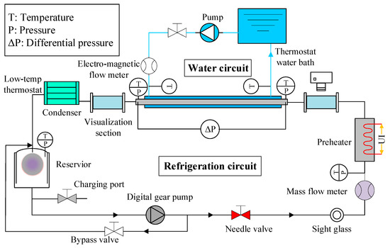 The refrigerant quality at the inlet of the test section, xin, is calculated from the heat exchange volume of water in the preheating section, where the total heat transfer (Equation (2)) of the refrigerant, Qt,ph, consists of the sum of the liquid phase sensible heat (Equation (3)) of the refrigerant, Qsens and the liquid-gas phase transition latent heat (Equation (4)) of the refrigerant, Qlat.
