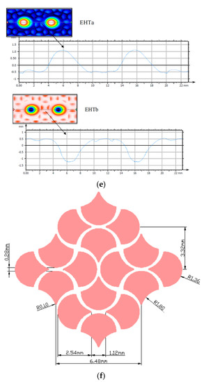 Surface enhancement pattern profiles and details for the following surfaces (a) Hydrophobic pattern (HY), (b) Herringbone pattern (HB), (c) Herringbone/Dimple pattern (HB/D), (d) Helical grooved pattern (HX), (e) EHT, and (f) details of the petal-shaped background pattern used in the EHT surface.