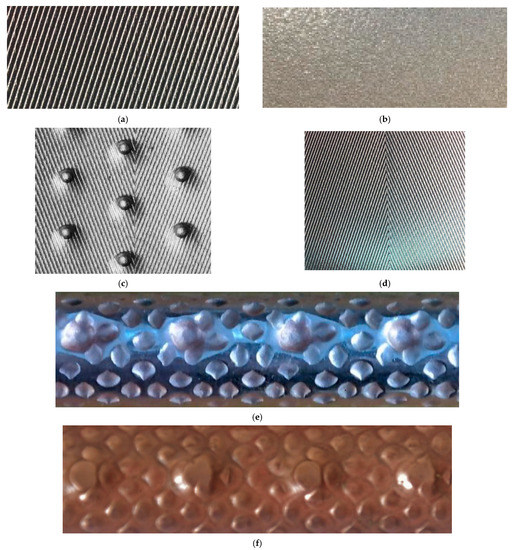 Images of the heat transfer surfaces that were evaluated: (a) SS-EHT-HX; (b) SS-EHT-HY; (c) SS-EHT-HB/D; (d) SS-EHT-HB; (e) Cu-EHTa; (f) Cu-EHTb.
