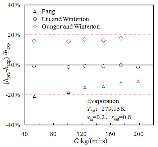 Several previous studies have proposed tube-side evaporation heat transfer models for smooth tubes; Liu et al. [21] and Gungor et al. [26] have proposed correlations that use enhancing and inhibiting factors in order to improve the convective boiling and nucleate boiling terms. Kandlikar [27] proposed a correlation that determines whether the flow is convection boiling or nucleate boiling based on Co and Frlo; in order to improve prediction accuracy, they introduce the parameter ffl—a parameter that is based on the working medium type. However, the above correlations are all based on smooth tubes; in order to consider the use of these correlations, they must first be evaluated for use with enhanced tubes. Figure 7 shows deviations (between experimental data and values predicted using different correlations) for the enhanced tubes considered in this study.