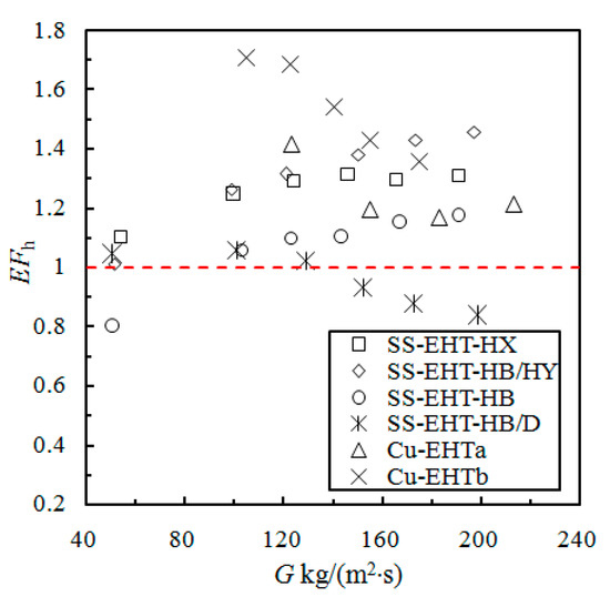 In order to compare the evaporation heat transfer coefficient in two-sided enhanced tubes, a heat transfer enhancement factor (EFh) is presented in Equation (16). It is defined as the ratio of the HTC of an enhanced tube to the HTC of a smooth tube under the same working conditions