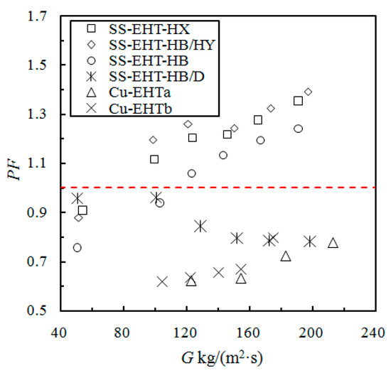 Figure 6 presents the PF of different enhanced tubes; when the mass flux rate is higher than 100 kg/(m2·s), the PF of the SS-EHT-HB/HY and the SS-EHT-HX tubes are all greater than 1, while the PF of the SS-EHT-HB/D, Cu-EHTa, and Cu-EHTb tubes are less than 1. When the mass flux rate is lower than 100 kg/(m2·s), the PF of all the enhanced tubes is less than 1; with an increasing mass flux rate, the PF increases for the SS-EHT-HB/HY, SS-EHT-HX, and SS-EHT-HBtubes, but decreases for the PF of the HB/D tube. Finally, the PF of the Cu-EHTa and Cu-EHTb tubes increases slowly.