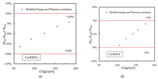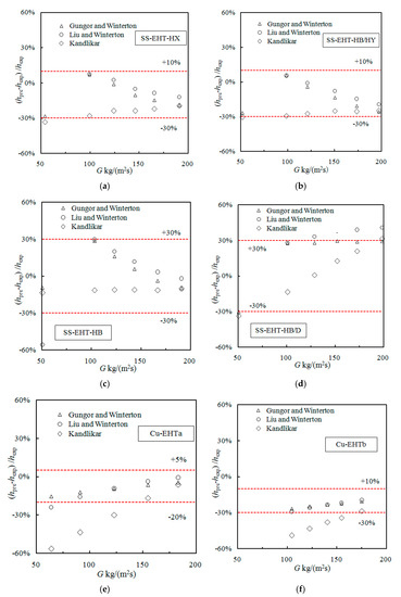 Comparison of the deviation of experimental data and values predicted using modified smooth tube models that can be used for enhanced tubecorrelations. (a) Prediction effect of the modified Kandlikar correlation for the SS-EHT-HX tube; (b) Prediction effect of the modified Kandlikar correlation for the SS-EHT-HB/HY tube; (c) Prediction effect of the modified Kandlikar correlation for the SS-EHT-HB tube; (d) Prediction effect of the modified Gungor and Winterton correlation for the SS-EHT-HB/D tube; (e) Prediction effect of the modified Gungor and Winterton correlation for the Cu-EHTa tube; (f) Prediction effect of the modified Gungor and Winterton correlation for the Cu-EHTb tube.