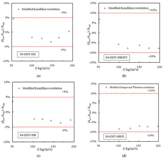 As shown in Figure 7, the predicted trends of the three correlations for the SS-EHT-HX and SS-EHT-HB/HY tubes demonstrate the same trend as they did for the heat transfer enhancement factor (EFh). Low values are predicted for the SS-EHT-HX, SS-EHT-HB/HY, Cu-EHTa, and Cu-EHTb tubes when using these three smooth tube correlations to predict enhanced tube performance; however, high values are predicted for the SS-EHT-HB/D tube. This is contrary to the heat transfer enhancement factor trend (EFh) for this tube. In general, the higher the measured heat transfer coefficient, the lower the predicted value. In summary, Gungor et al. [26] predict that 94.3% of data points are within ±30%; Kandlikar [27] and Liu et al. [25] both predict that 68.6% of data points are within ±30%. Based upon this accuracy, the existing correlations are not suitable for guiding engineering design because the predicted enhanced tube value of evaporation heat transfer deviates greatly from the measured values of the enhanced tubes. As a result, the existing correlations must be modified so that they are applicable for use with enhanced tubes and the deviation is within an acceptable range. Figure 8 presents a comparison of the deviation of the experimental data and the values predicted using correlations modified for use with enhanced tubes. Table 3 details the modified correlations.
