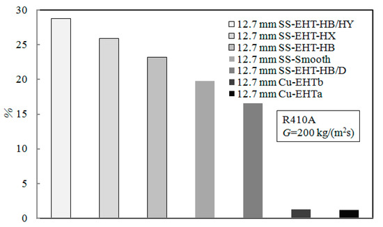 Figure 5 compares the heat transfer enhancement factor of the enhanced tubes that were evaluated in this study. The heat transfer enhanced factor of the Cu-EHTb tube is the highest, followed by the SS-EHT-HB/HY, SS-EHT-HX, Cu-EHTa, SS-EHT-HB, and SS-EHT-HB/D tubes; some tubes do not improve heat transfer. For the Cu-EHTa, Cu-EHTb, and SS-EHT-HB/D tubes, the heat transfer factor shows a downward trend, while for the SS-EHT-HB/HY, SS-EHT-HX, and SS-EHT-HB tubes, there is an upward trend. When the mass flux rate is lower than 150 kg/m2s, the Cu-EHTb provides the best enhancement.