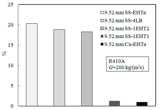 Wall thermal resistance is the conductive thermal resistance of the tube wall; total evaporation thermal resistance (shown as part of Equation (7)) is the total thermal resistance. It can be seen from Figure 9 that the wall thermal resistance of the 12.7 mm OD stainless steel tube is approximately 15% of the total evaporation heat transfer resistance; this is in contrast to the wall thermal resistance of a copper tube, which is less than 1.5% of the total evaporation heat transfer resistance. It can be seen from Figure 10 that the wall thermal resistance of the 9.52 mm stainless steel tube exceeds 18% of the overall evaporation heat transfer resistance, while the thermal wall resistance of the copper tube is less than 1.5% of the evaporation heat transfer resistance. For 12.7 mm and 9.52 mm tube types, the influence of stainless steel materials on evaporation heat transfer cannot be ignored, while copper wall materials produce much less thermal wall resistance.