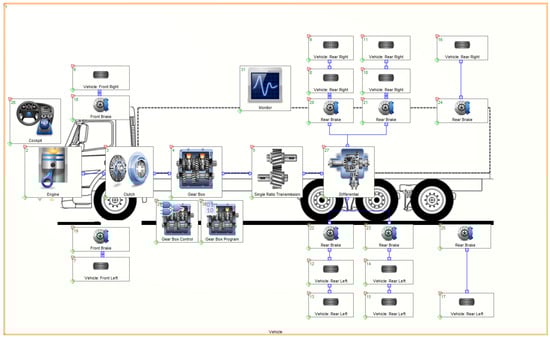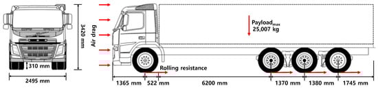 Data, such as vehicle dimensions, weight, center of gravity position, and air drag coefficient can be inputted in the ‘Vehicle’ component of the software. Based on these input values, resistance and wheel loads are calculated during driving. Specifically, the effects of acceleration, aerodynamic drag, and rolling resistance are considered. The modeled test vehicle consisted of an 8 × 4 type manualized automatic gearbox with a gross weight of 35 tonnes. Note that the 8 × 4 rigid truck is not a very typical truck. The dimensions of the vehicle are shown in Figure 2, and its detailed dimensions are listed in Table 1.