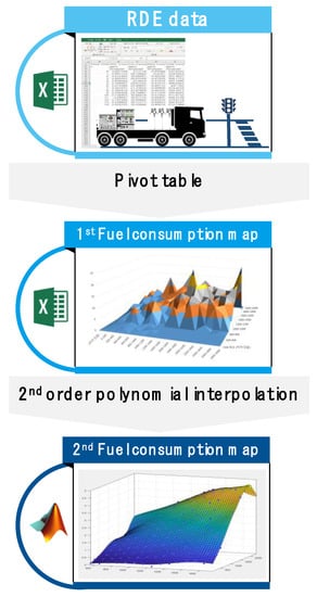 Fuel efficiency maps denote fuel consumption rates with respect to engine speed and torque, which, in turn, are parameters that are directly related to the calculated fuel economy [16]. In this study, fuel efficiency maps are derived from engine speed, torque, and fuel consumption data, which are measured over time while driving on real roads, and the sequence is shown in Figure 3. In the real road driving data, there is an operating range that is not measured, or only a small number of measurements are conducted in this operating range. Thus, the fuel efficiency map should be calibrated to derive fuel consumption data for these operating ranges. First, many operating points were divided into several operating ranges using the pivot table. The engine speed was set at 200 rpm intervals, and the engine torque was set at 100 Nm intervals, and the average fuel consumption rate (primary fuel efficiency map) of the operating range with the median value of these ranges was derived. Given that the primary fuel efficiency map is irregular in shape with a curved surface due to the unmeasured region, we performed a calibration task to smooth the curve by applying a quadratic polynomial interpolation method using MATLAB (secondary fuel efficiency map).