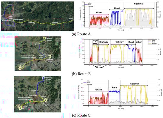 When comparing Route A and Route B, Route B exhibited a higher ratio of highway sections and higher average vehicle speed for all sections than Route A. When comparing Route A and Route C, the driving cycles for both routes were in the order of urban, rural, and highway. Furthermore, both routes exhibited a similar driving time ratio for each section. Additionally, the average vehicle velocity was approximately 10 km/h higher for Route C with the exception of the urban section. The comparison of Route B and Route C is similar to those of Route A and Route B because the driving characteristics of Route A and C are similar. Specifically, Route B had a large proportion of highway sections, and the average vehicle velocity for Route B was approximately 10 km/h higher in urban and rural sections, with similar highway sections.
