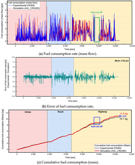 Figure 5 compares the predicted fuel consumption rate and cumulative fuel consumption in Route A with values measured by real road driving. A comparison of the fuel consumption rate in g/s with the test value indicates that the average error was 0.02 g/s. Compared to the experimental values, the cumulative fuel consumption in terms of mass (kg) exhibited an error of approximately 3.1% in urban areas, although the tendency was consistent. This is attributed to the large percentage of acceleration and deceleration in urban areas, and the accuracy of the shift was relatively low. Rural sections exhibited a low error of approximately 0.54% and displayed high predictive accuracy. For the highway section, the fuel-cut function was activated for the real road test [17]. However, cumulative fuel consumption was calculated to be about 3.1% higher than the experimental value. Consequently, the cumulative fuel consumption for the entire section was compared, and the error was estimated as 3.4%, which was sufficient to ensure the reliability of the results in the study.
