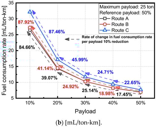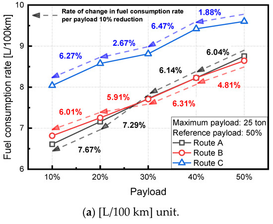The maximum payload corresponds to the maximum weight that can be loaded within the range of the tonnage of cargo indicated on the truck, and the maximum payload of the test vehicle in the study was approximately 25 tonnes. Figure 6a shows the fuel consumption rate according to the payload for each driving route, where the unit of fuel consumption rate is one liter per 100 km [L/100 km]. The impact on the fuel consumption rate was analyzed as the payload during the real road test corresponded to 50% of the maximum payload and was reduced by 10% intervals based on the maximum payload. Overall, as the payload decreased, the fuel efficiency improved. As the payload decreased by 10% intervals from 50 to 10% based on the maximum payload, the fuel efficiency was improved by 6.79%, on average, in Route A. In the case of Route B and Route C, it was improved by 5.76 and 4.32%, on average, respectively. Thus, it can be confirmed that the fuel efficiency improvement rate in accordance with the payload varies depending on the route characteristics. Route A and Route B exhibited similar fuel consumption rates and can be seen to improve compared to Route C. In the case of Route A, the number of stops in urban and highway sections was less than that in Route C, and the vehicle was driven at a constant speed on highway sections. Thus, an improvement in the fuel consumption rate was observed. Additionally, in the case of Route B, an improvement in the fuel consumption rate was noted given the large proportion of highway sections and low variation in vehicle speed compared to Route C.