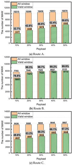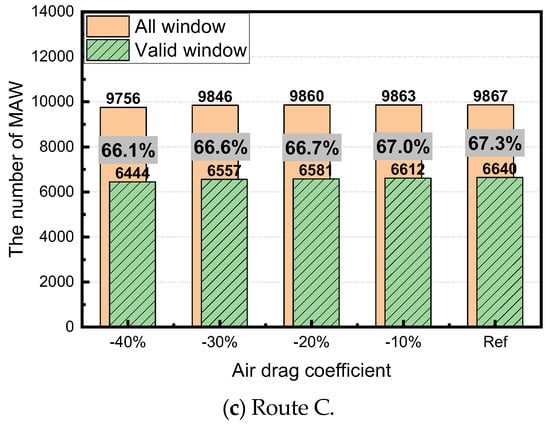 Figure 9 shows the number of moving average windows according to the air drag coefficient and the ratio of the valid window. When the air drag coefficient decreased by 40% compared to the reference value, the ratio of the valid window decreased by 3.5, 0.7, and 1.2% in Routes A, B, and C, respectively, and no test was observed as invalid. This means that the change in the required engine output compared to the reduction rate of the aerodynamic drag coefficient is not large. Thus, the reduction rate in the ratio of the valid window compared to the fuel efficiency improvement rate can be determined as low. For example, a reduction in the payload for Route A from 50 to 40% improves fuel consumption by 6.4% and lowers the valid window ratio by 7.2%, thereby indicating that a 5.1% improvement in fuel consumption decreases the valid window ratio by approximately 5.7%. In comparison, a decrease in the air drag coefficient by 40% compared to the reference value improves fuel consumption by 5.1% and decreases the valid window ratio by 3.5%. Thus, if the driving speed is low, then the reduction in the fuel efficiency improvement rate due to decreases in the air drag coefficient is not significant. However, if the fuel efficiency improvement rate is the same, the decrease rate of the valid window can be reduced.