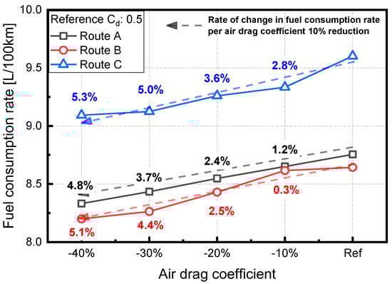 Figure 8 shows the fuel consumption rate with respect to the air drag coefficient. The air drag coefficient corresponds to the coefficient of form for the flow of air. As the air drag coefficient decreases, the air resistance decreases. If the air resistance decreases and driving resistance decreases, then fuel economy improves because the vehicle can be driven at a relatively low output. In 2020, the highest temperature in Korea corresponded to 33.9 °C, and the lowest temperature corresponded to −17.5 °C. Furthermore, air density increases by approximately 20% if the temperature decreases by the aforementioned temperature difference under atmospheric pressure. Additionally, techniques such as changes in vehicle geometry can reduce the air drag coefficient by approximately 10%. Therefore, it is assumed that the air drag coefficient decreases by 40% compared to the reference value. This factor multiplied by the area of the front of the vehicle is proportional to the aerodynamic drag and is calculated as follows [12]: