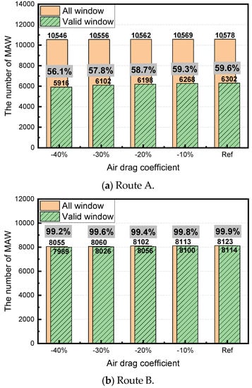 Number of MAWs and the ratio of the valid window with respect to air drag coefficient for each route.