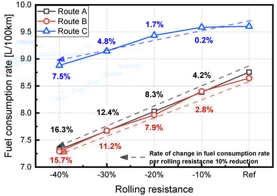 Figure 10 shows the rate of fuel consumption due to rolling resistance. In the study, we assume that rolling resistance does not change with respect to vehicle speed. As shown in the figure, as the rolling resistance decreases by 10% based on the value applied during feasibility validation, the fuel consumption rate is improved. If the rolling resistance decreases by 40% compared to the reference value, then the fuel consumption rate for Routes A, B, and C improves 16.3, 15.7, and 7.5%, respectively, which, in turn, exceeds the effect of the air drag coefficient. It is considered that rolling resistance is relatively higher than the air drag coefficient because, as previously mentioned, the rolling resistance generally corresponds to the dominant factor in driving resistance, as opposed to aerodynamic drag, if the vehicle speed does not exceed 100 km/h in general. The rolling resistance factor is affected by tire air pressure, speed, and load. Specially, it is significantly affected by tire air pressure [19]. Therefore, fuel economy can be easily improved by decreasing rolling resistance via increasing tire air pressure.