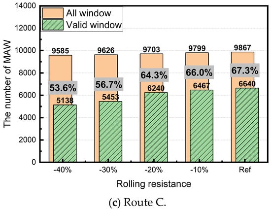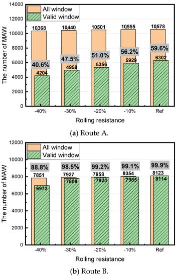 Number of MAWs and the ratio of the valid window with respect to the rolling resistance for each route.