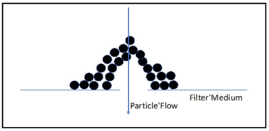 Particulate buildup on the surface of the filter leads to the development of a cake, which is instrumental in the further separation of PM. These cakes ensure sufficient filtration efficiency (defined as the ratio of filtered particles to total input particles) over a range of particle sizes at a range of velocities and are a vital part of the design of the filter [,,]. Cake filtration is particularly useful for separating dust particles as these typically are the smallest of the PM (diameter 1–5 µm) []. The filter cake, however, leads to increased pressure drop []. The balance that must be struck in the design of the filters is with regard to the pore sizes. The smaller the pore size, the more efficient the separation of particles. However, smaller pore size leads to faster cake buildup and thus increased pressure drop (along with an initial higher pressure drop). On the contrary, if pore sizes are increased, there will be slower cake build up and less pressure drop but the separation of particles will be less efficient. The other factor at play is the mechanism of depth filtration. Often depth filtration leads to an exponential increase in pressure drop and as the pores become blocked, cake filtration takes over causing the pressure drop to increase linearly as more particles are accumulated [,].