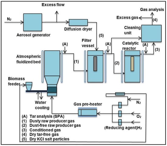 Coking can occur by chemisorption, which entails the formation of a reacted carbon monolayer over the catalyst’s active sites or by physisorption, which entails multilayers of adsorbed carbon that also block the surface sites. Carbon that is deposited initially has a more reactive amorphous structure but, over time and as temperature increases, these structures give way to more stable graphitic structures. Tar formation can also plug pores thus blocking access to the inner pore surface area and active sites within []. Promoters such as Mg, Ca, and K can be used to help decrease coking by lowering acidic strength []; however, decreased acidity leads to lower tar conversion so a balance must be struck [,]. This strategy was used by Moud, et al. [] who investigated tar, alkali, and sulfur-laden syngas. Tar reforming was performed using Ni with a K promoter. The setup (shown in Figure 4 []) used a 5 kW atmospheric bubbling fluidized gasifier and a hot gas ceramic filter downstream of the gasifier to separate PM. A fixed bed catalytic reactor was located downstream of the ceramic filter for tar removal, which resulted in nearly 100% tar conversion over a period of 36 h of performance time on the process stream.