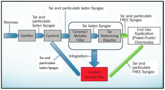 Ceramics already play a part as catalyst support for increased hydrogen production through steam reforming [,,] and downstream water-gas shift processes []. Another promising option for clean hydrogen production is through solid oxide membranes used for the electrolysis of water, which takes advantage of ceramics coated with a catalyst layer []. Ceramic filters have proven to be effective at removing particulate matter as well as catalyst support, albeit independently. Integrated dual use of ceramic filters for particulate removal and as catalyst support has not seen much commercial success and is in the early developmental phase. Thus, the focus of this article is geared toward the use of ceramic filters for integrated hot gas cleanup applications with extended emphasis on their application in gasification. Integration-process intensification, will ultimately contribute to reducing the costs for green hydrogen production via. gasification.