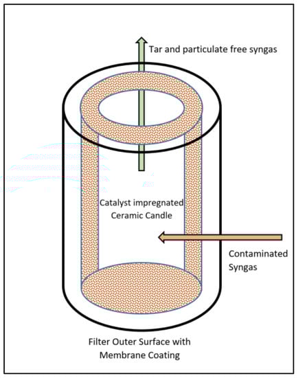 The concept of impregnating catalyst particles onto a porous ceramic for the purposes of tar reforming has been investigated. The next step is to use a catalyst support (non-powder) whose material is the same ceramic that is used in hot gas filtration. The topic of impregnating catalysts on ceramic filters for use of the dual effect of particulate filtration and tar reforming has been seen in several studies [,,,,,,,]. The following describes the application of catalytic filter units and their role in the process where raw syngas will encounter a ceramic candle and first will filter the PM by the use of a fine membrane coating the outside of the candle or by the actual surface of the candle itself. This will cause a PM cake to buildup on the outside of the candle but tar molecules will penetrate the membrane and outer surface of the candle into the inner pore structure. These inner pores have catalysts dispersed onto their surface area, which will reform tars to produce more syngas. Reformed clean syngas then flows to the inner hollow core of the candle and onto the next processing unit. This process is depicted in Figure 6. Studies investigating the process intensification concept when applied to biomass gasification through in-situ and ex-situ catalysis arrangements are discussed herein.