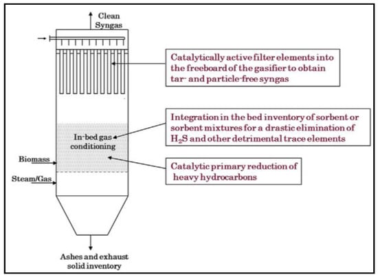 The method of in-situ catalysis when applied to tar reforming involves placing the catalyst within the same unit where gasification takes place. Often this is done through the use of primary catalysts where catalyst materials are blended with fluidized bed material or used as fluidized bed material themselves []. This is a common strategy to control tars before they exit the gasifier. It has been demonstrated that filtration and tar reforming can both be performed in-situ whereby catalytic ceramic filters are placed within the gasifier, which allows gasification, particulate filtration, and tar reforming to take place all in one unit []. In the UNIQUE gasification configuration, catalytic candle filters are strategically placed within the freeboard section of a fluidized bed gasifier [,,,,,,,,,,,,,,,,]. This arrangement is shown in Figure 7 []. The advantage of in-situ catalysis is the ability to perform all three major process functions, gasification, particulate filtration, and tar reforming in one reactor, which will allow savings on capital costs and system space requirements while increasing thermal efficiency []. This compact design concept avoids the need for cooling, which is where complications involving tar condensation are most likely to occur.