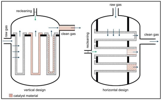 Volatile organic compounds (VOCs) are another pollutant that has been of particular focus to researchers. Along with NOx, VOCs are also responsible for ground-level ozone production and can cause health issues. Additionally, VOCs are often emitted with NOx and SOx from mobile sources such as in the automotive industry, and also from stationary sources such as industrial boilers, power production, and the architectural industry. The classification of VOCs includes anything that contains carbon, has a high vapor pressure at room temperature, and usually but not necessarily causes negative health effects []. They can take the form of ringed carbons such as naphthalene but can also be shorter chained compounds such as propane or propene []. Chlorinated VOCs can also be formed through a number of mechanisms and these have a host of health hazards but can be oxidized to form HCl, which can be removed through adsorption []. It is sometimes economical for VOCs present in low concentration in flue gas to be adsorbed; however, this may require frequent regeneration of the adsorbent and depending on the VOC components may be difficult due to rapid desorption and thus VOC oxidation is the preferable route []. Hence, VOCs have been added to the list of pollutants that researchers are attempting to remove within a single unit using catalytic ceramic filters to further increase process efficiency and reduce costs [,,,,,]. The typical design for this process application is illustrated in Figure 2 [].