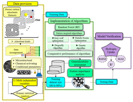 In this study, hydrogen uptake is modeled using four nature-inspired algorithms in the random forests (RFs) model. Four main categories include the characteristics of adsorbent type, chemical activation, and the micro-structural and operational conditions modeled using the RF model. The ML assessment accurately predicted the porous carbon adsorbents for hydrogen storage. Dragonfly, grey wolf, particle swarm, and genetic optimization algorithms exhibited 0.91 to 0.93 and 0.99 of R2 for the test and train phases, respectively. Moreover, the generalizability analysis in the training size area of 60 to 80% leads to accuracies of 0.29 to 0.34 of RMSE, 0.18 to 0.19 of MAE, and 0.99 of R2 in the training phase. In the test phase, these values achieved 0.6 to 1, 0.4 to 0.5, and 0.84 to 0.93, respectively. The sensitivity analysis demonstrated the ranks for temperature, total pore volume, specific surface area, and micropore volume in first to fourth, with relevancy scores of 1 and 0.48. The RF model as a machine learning (ML) technique endorses the computational approach to achieve the advanced H2 energy storage objectives. The contribution can be stated in several points such as: (i) This work creates ML models to estimate the hydrogen storage capacities of different porous carbon adsorbents. This model may be used to guide the design of novel adsorbents for hydrogen storage, a crucial step in the development of renewable energy sources. (ii) The nature-inspired algorithms such as GWO, DA, GA, and PSO choose the model’s most pertinent characteristics. These algorithms are well-known for discovering optimal solutions to complicated problems, as they are based on evolution and the swarm behavior observed in nature. (iii) The achievements have demonstrated that using nature-inspired methods to pick model features enhances the model’s accuracy. In addition to its accuracy and resilience, the random forest algorithm is a useful approach to estimating the hydrogen storage capacities of porous carbon adsorbents. (iv) The survey sheds light on the connection between the structural characteristics of carbon materials and their hydrogen storage capacities. This can inform the creation of novel hydrogen storage materials with optimal architectures.
