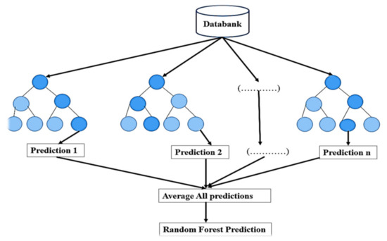 Random forests (RFs) are a set of approaches consisting of the construction of decision tree collecting, derived from a randomly varying tree orientation program. The decision trees are prominent options to address the related challenges as they exhibit low bias and large variation. These make them very probable to benefit from an optimization model [41]. Figure 3 displays the random forest approach for the regression issue. The procedure of the RF model for training data is summarized as follows [42]: (i) Select generated data points randomly from the training sample. (ii) Construct a tree structure connected with the number of data samples. (iii) Select the number N of trees for a certain aim to develop and repeat steps 1 and 2. (iv) For new data samples, forecast the value for the data sample using each of the N-tree trees, and exhibit the new data sample to the average of all anticipated values. Indeed, this ML model provides a deep understanding of the decision tree by controlling the level of nonlinearity in the training database [41,43]. Each tree is generated based on the randomly selected subset of the variables in the decision tree-building process, and creates various results from different trees. The average marks of all the decision trees are determined as the outcomes of the RF models [44]. This objective is completed by switching Out-of-Bag (OOB) samples from a specific predictor to estimate the increase in evaluation error, while the remaining parameter is kept the same. The mean square error () is determined as follows [41,45]:
