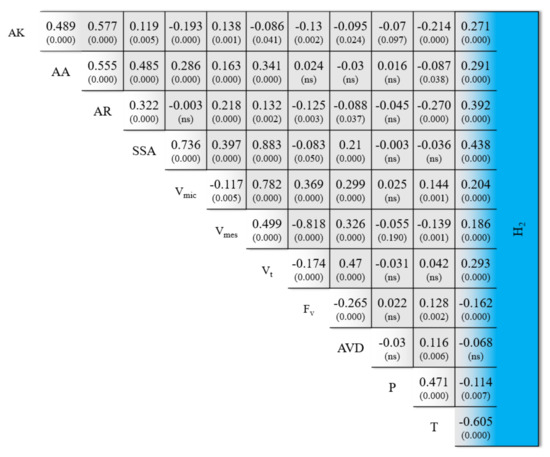 Pearson correlation matrix of the input variables and hydrogen uptake as an output variable. The values display the value of the correlation and the significance levels in parentheses between all variables.