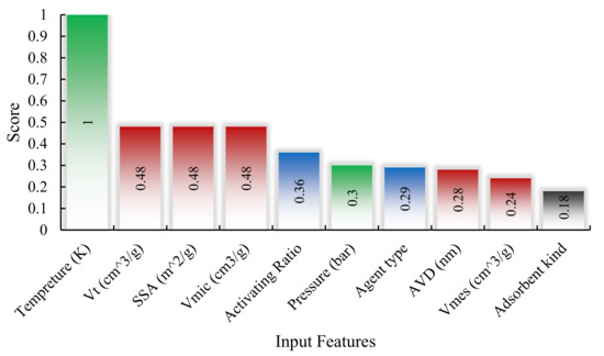 Sensitivity analysis is achieved based on the measured relevancy score to investigate the impact of the inputs on hydrogen storage. As can be seen in Figure 6, temperature and pressure contain the 1 and 0.3 scores in the first and sixth ranks. In addition, the micro-structural variables of total pore volume, SSA, and Vmic exhibit scores of 0.48 in the second to fourth ranks. The average pore diameter and mesopore volume have 0.28 and 0.24 scores. These values comparatively are low in comparison with the other values. Adsorbent kinds (biochar, activated carbon, and metal-doped carbon) comparatively have a score of 0.18.
