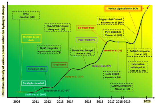 The review of studies utilized various precursors to synthesize various porous adsorbent materials for hydrogen storage [16,18,33,59,60,64,72,80,83,86,90,93,97,98,104,107].