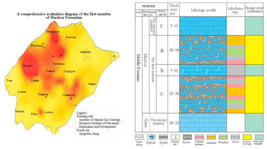 Located in the south-central part of the Asian continent, Sichuan Basin is one of the four great basins in China. On the plane, it can be divided into five tectonic units—low and gentle tectonic zone in Northern Sichuan, low and steep tectonic zone in Western Sichuan, low and steep tectonic zone in Southern Sichuan, flat and gentle tectonic zone in Central Sichuan, and high and steep tectonic zone in Eastern Sichuan (Figure 1). Before the Permian sedimentation, the basin was affected by the stretching and tension of the Paleo-Tethys Ocean—it was a passive continental margin basin and experienced large-scale exposure and denudation [11,12]. Till the Permian sedimentation, the crust sank completely. Except for the Dabashan Archicontinent in the north, Longmenshan Archicontinent in the northwest, Kangdian Archicontinent in the west, and Jiangnan Archicontinent in the east that emerged out of the water surface in island chains or islets, the upper Yangtze Archicontinent was completely submerged, and extensive transgression made the Middle Permian cover the strata of Carboniferous and other ages [13]. In this study, the target stratum is in the sedimentation period of the first member of Maokou Formation. The ancient landform was relatively low, the water was relatively deep from Guangyuan in Northwestern Sichuan and Guang’an in Northeastern Sichuan to the east of Chongqing, and it was mainly deposited in the deep and gentle slopes. From the regional sedimentation setting, the sedimentation period of the first member of Maokou Formation was favorable for the development and distribution of marine source rocks.