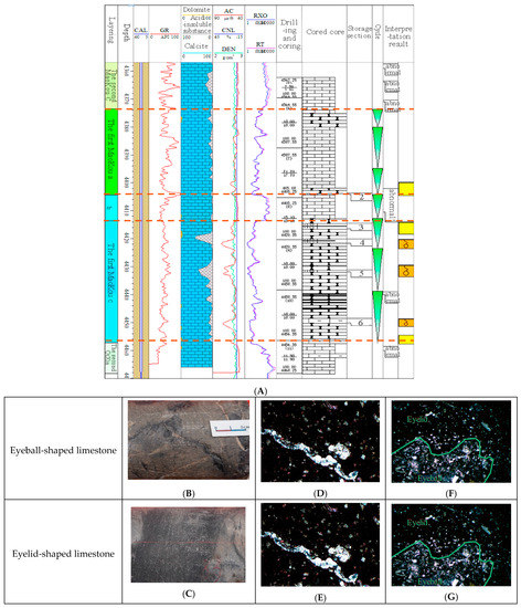 - Li, A.; Luo, K.; Li, F.; Pan, W.; Peng, J.; Deng, M.; Li, L. Genesis of eyeball-shaped limestone and its significance for petroleum geology. Pet. Geol. Exp. 2021, 43, 452–460. [Google Scholar]