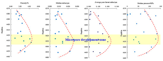Based on the high-pressure mercury injection data, it is evident that with the increase in depth, the skewness of the pore throat of the first member of Maokou Formation in the capillary pressure curve changed from fine skewness to coarse skewness, the mercury injection curve is gentle, and the average value of maximum mercury injection saturation is above 80%; these reservoir characteristics indicate good sorting of pore throat size [21]. The displacement pressure of eyelid-shaped limestone is low, and the oil and gas entered and accumulated easily. Compared with eyeball-shaped limestone, the average porosity of eyelid-shaped limestone is 2.84%, and the maximum pore throat radius and average pore throat radius are higher (Table 2). Eyelid-shaped limestone has a stronger reservoir capacity and better pore throat connectivity. Overall, the pore throat characteristics of the eyelid-shaped limestone of the tight marl in the first member of Maokou Formation are obviously better than that of the eyeball-shaped limestone. Organic pores are an important reservoir space and mainly feature micron pores and nano pores, with low-porosity and permeability-based accumulation. The micropores are more developed near 4430 m (the lower member c of the first member of Maokou Formation), and there is a relatively high pore zone with respect to the tight background (Figure 4).