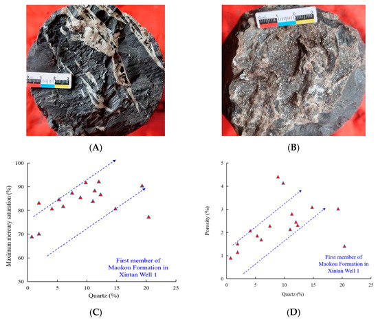 Brittle minerals in the first member of Maokou Formation in Eastern Sichuan improved the reservoir. (A): In the lower member a of the first member of Maokou Formation (4375.05 m), micrite and fractures developed and were filled with calcite. (B): In the lower member a of the first member of Maokou Formation (4383.55 m), fractures were filled with micrite and calcite. (C): Quartz and maximum mercury saturation diagram of the First member of Maokou Formation in Xintan Well 1. (D): Quartz and porosity diagram of the First member of Maokou Formation in Xintan Well 1.