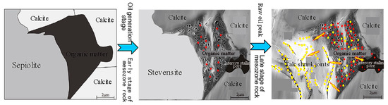 The mud in the eyelid-shaped limestone was not terrigenous detrital clay mineral but clay mineral in the constructive diagenesis stage. At the early diagenesis stage, the clay mineral was mainly palygorskite-sepiolite. With the increase of burial depth in the middle and late diagenesis stages, the temperature and pressure increased, the pore fluid in sepiolite discharged, and the intergranular layer chain collapsed and then gradually turned into talc and a small amount of smectite. Talc further replaced sepiolite at the early diagenetic stage, and stucco and organisms at the sedimentary stage [34,35]. Meanwhile, organic matter micropores formed due to hydrocarbon generation at the middle diagenetic stage and talc shrinkage pores (fractures) formed in the process of sepiolite dehydration to talc transformation (Figure 8), became the effective reservoir space.