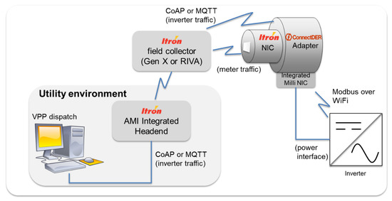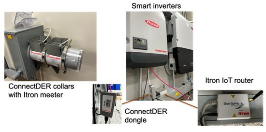 Figure 4 shows the physical connections between the smart meter and the smart inverter. Two collars were installed on the smart meter to interface with two inverters. The ConnectDER dongle connects to an inverter via a physical wire, using an RS-485 interface, and wirelessly to the Itron IoT router, which acts as a virtual network collector: it receives messages via Mili NIC and relays to the university information technology (IT) network through the Starfish development portal. The ConnectDER Wi-Fi Bridge device (the “dongle”) communicates with the SMA or Fronius inverters.