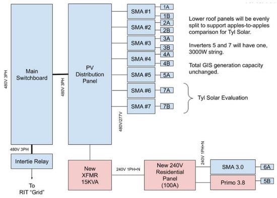 Figure 3 shows the block diagram of the new microgrid. The modified microgrid features a new transformer, the 240 V residential-style panel, and two new inverters. Also installed was a residential metering socket to monitor energy flowing into and out of the 240 V subpanel, installed after the transformer (installed in this location so that transformer inefficiency, however small, would not significantly affect the data).