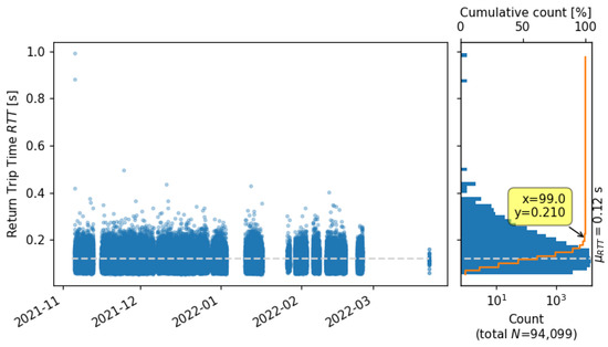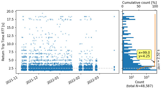 Figure 6 shows the results. The subplot to the left shows the RTT data points received over time, while the subplot on the right shows the corresponding histogram. Most RTT data points were in the order of a few seconds, but occasional round trips took an order of magnitude longer.