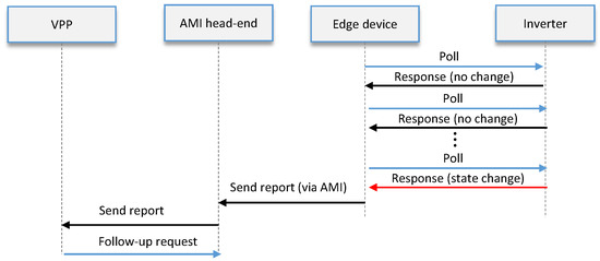 The proposed edge device interacts with the inverter at a much faster rate. Then, it notifies the VPP via the AMI communications network only when the state changes or responds to the request. The mechanism also reduces the number of end-to-end round trips through the interface. This approach can allow reporting by exception when trigger limits are exceeded beyond the ride-through interval.