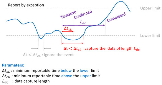 denote the minimum time to report below the lower limit, minimum time to report above the upper limit, and the length of data capture, respectively.
