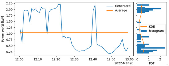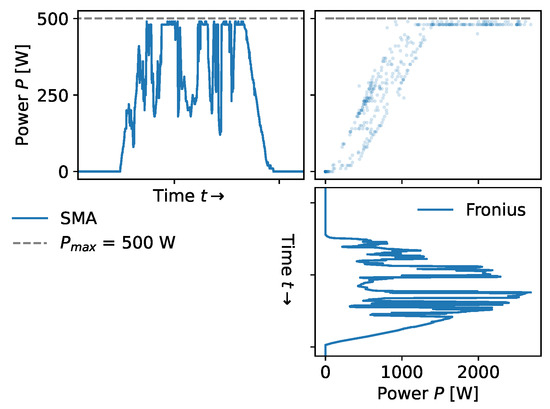 The set point for the SMA inverter was 16.7% of the maximum power, which translates to 500 W. Power generated by the Fronius inverter was not subjected to limits and was used as a reference. It is shown in the time domain on the lower-right subplot, rotated by 90° to map the values on the x-axis of the plot. The limited SMA power is shown in the upper-left corner; the scatter plot with Fronius active power is on the x-axis, and SMA active power is on the y-axis. The scatter indicates a high correlation between the power of the two inverters, except when the power of the SMA is limited to 500 W.
