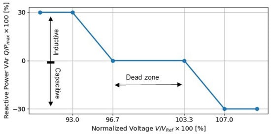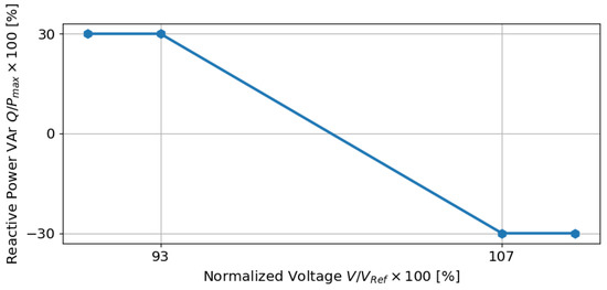 The Static Volt-VAr function provides one or more Volt-VAr arrays, each of which consists of Volt-VAr pairs: a set of voltage levels and their corresponding VAr levels that connect as a piecewise linear function with hysteresis. Hysteresis is not required; if not present, the falling voltage curve follows the rising curve. The Volt-VAr curve defined by CA Rule 21 was used as a starting point for demonstration.