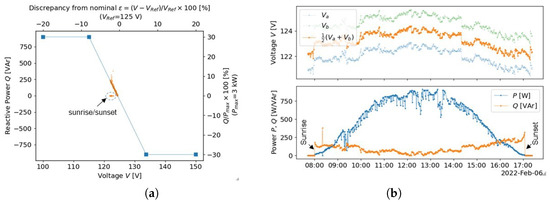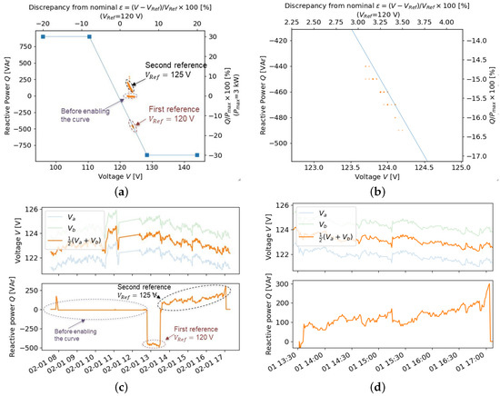 Setting up Volt-VAr curve: (a) Volt-VAr space close-up near 125 V reference; (b) second cluster close-up; (c) time domain; (d) time domain close-up.