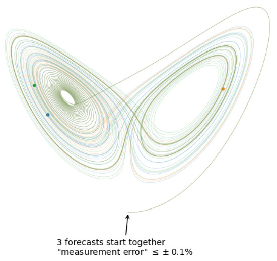 Example of “butterfly effect”: three forecasts start together and remain overlap for a while, but as time evolves, each can end up in any region of the manifold, independent from its initial neighbors.